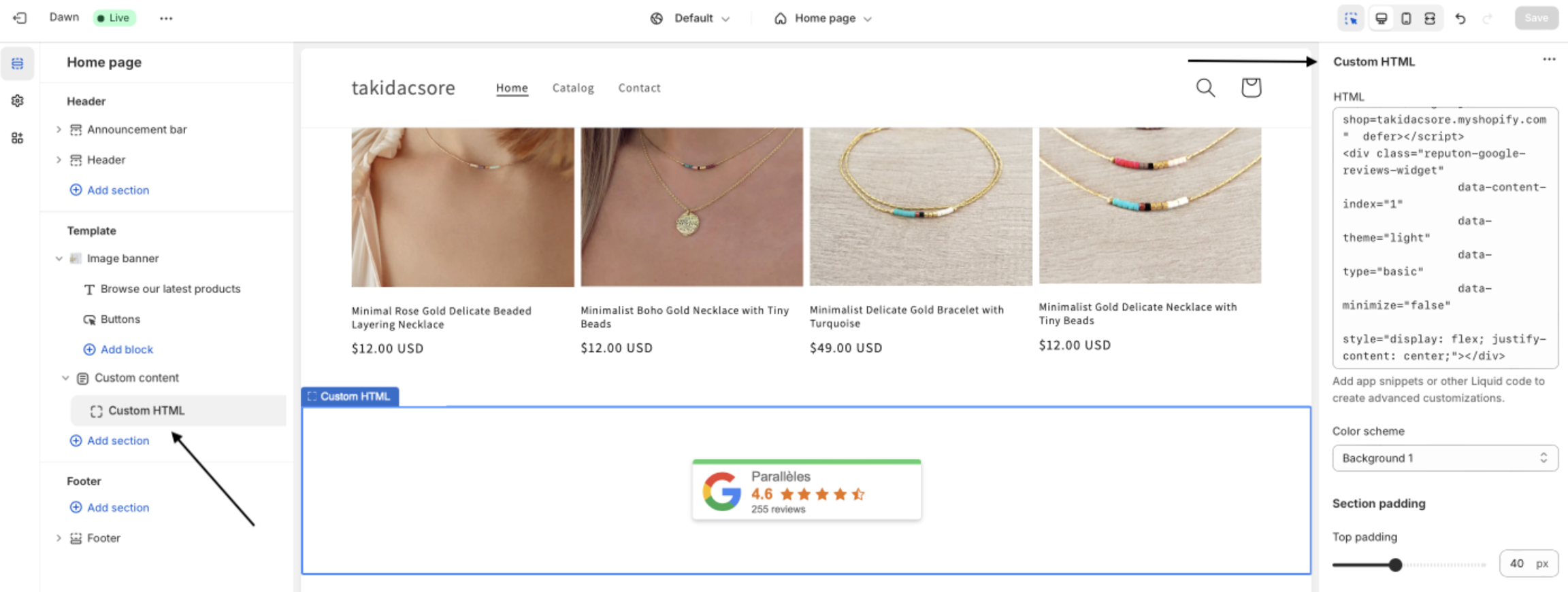 Go to Theme Customization, select Custom Liquid, then add your widget code. Don’t forget to click Save to apply the changes.